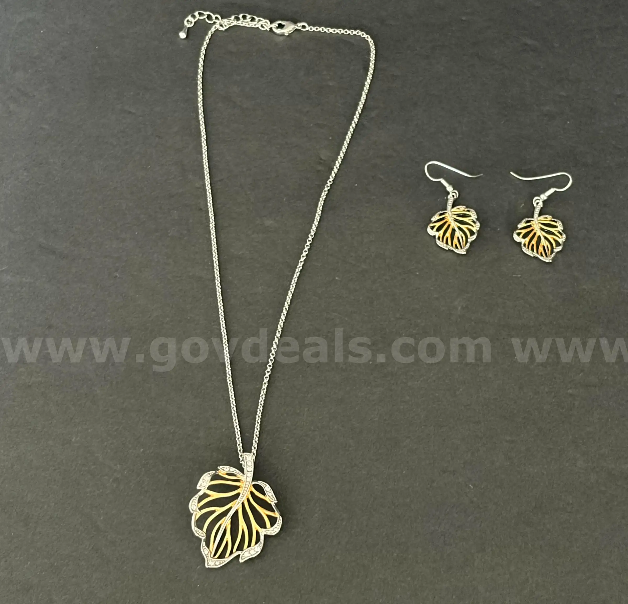 | Item: | Beautiful Set of Leaf Neckless and Earrings - Two-toned with stones. |