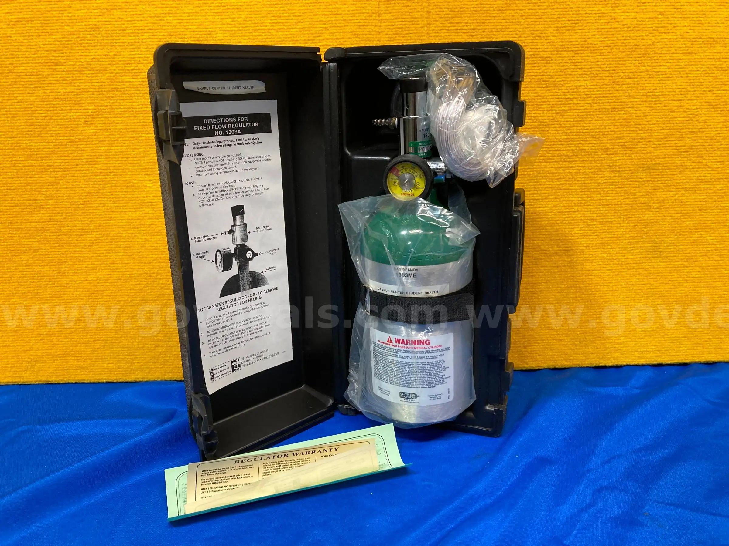 | Item: | (1) Mada Oxygen Tank with Fixed Flow Regulator and (1) Carrying Case |