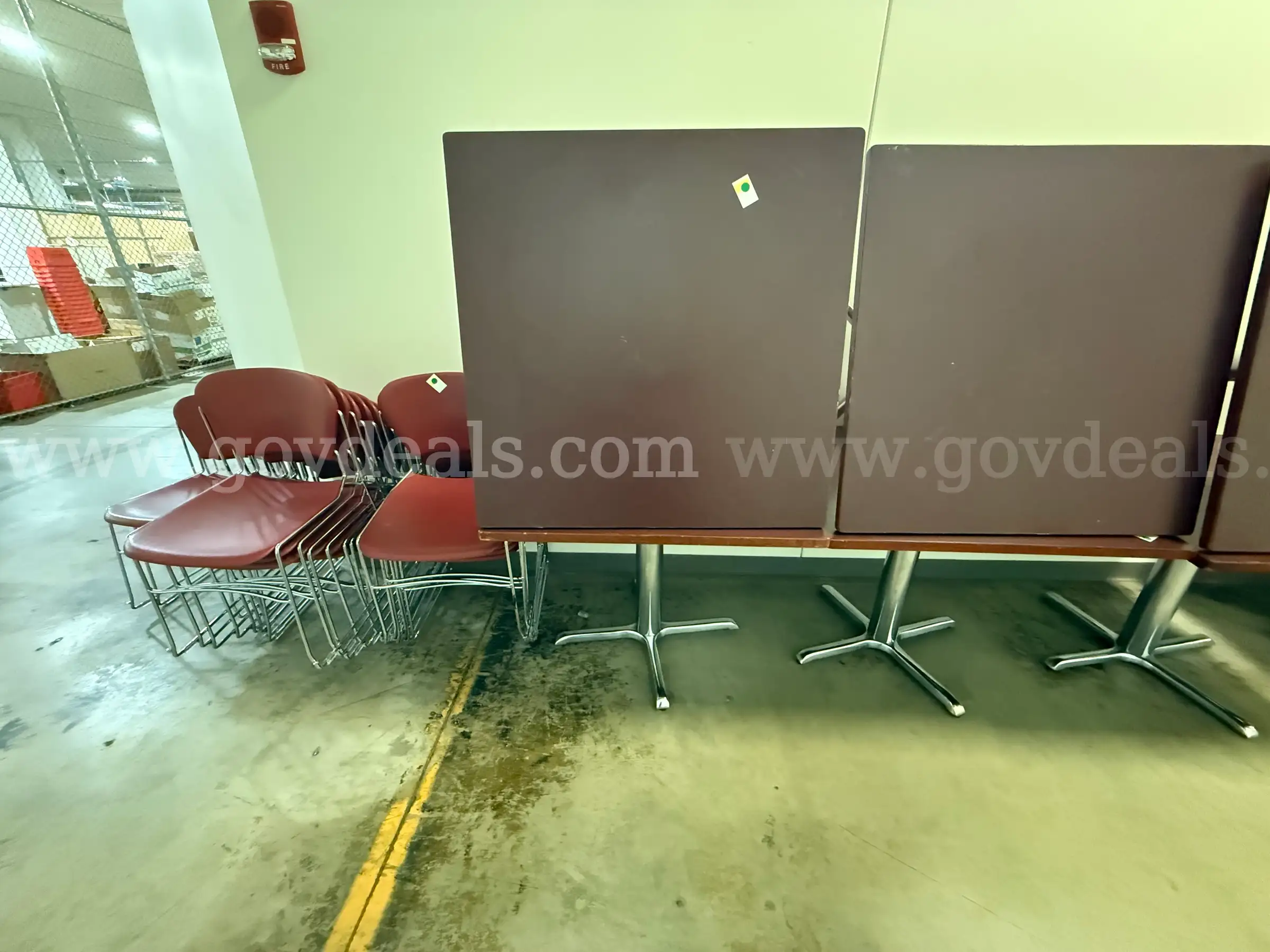 | Item: | 4 Amber Cherry Wood Top Tables with 16 Red Stacking Chairs |