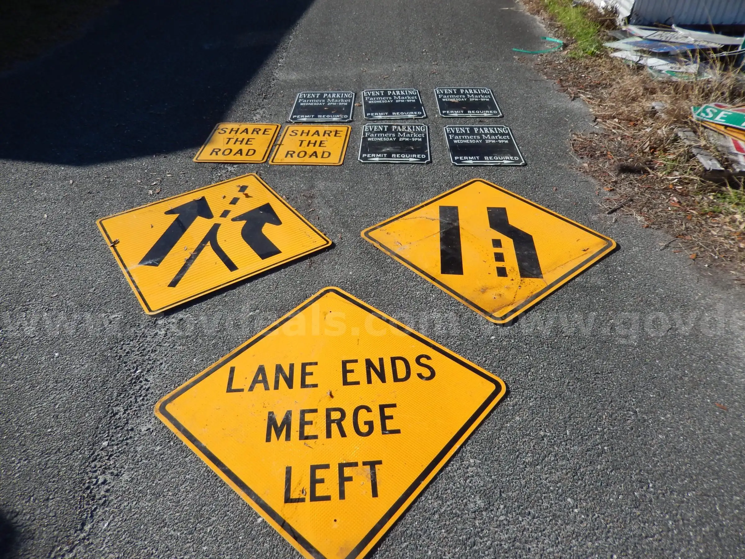 | Item: | USED (5) EVENT PARKING SIGNS (2) SHARE THE ROAD SIGNS (2) ROAD SIGNS (1) LANE ENDS MERGE LEFT SIGN |