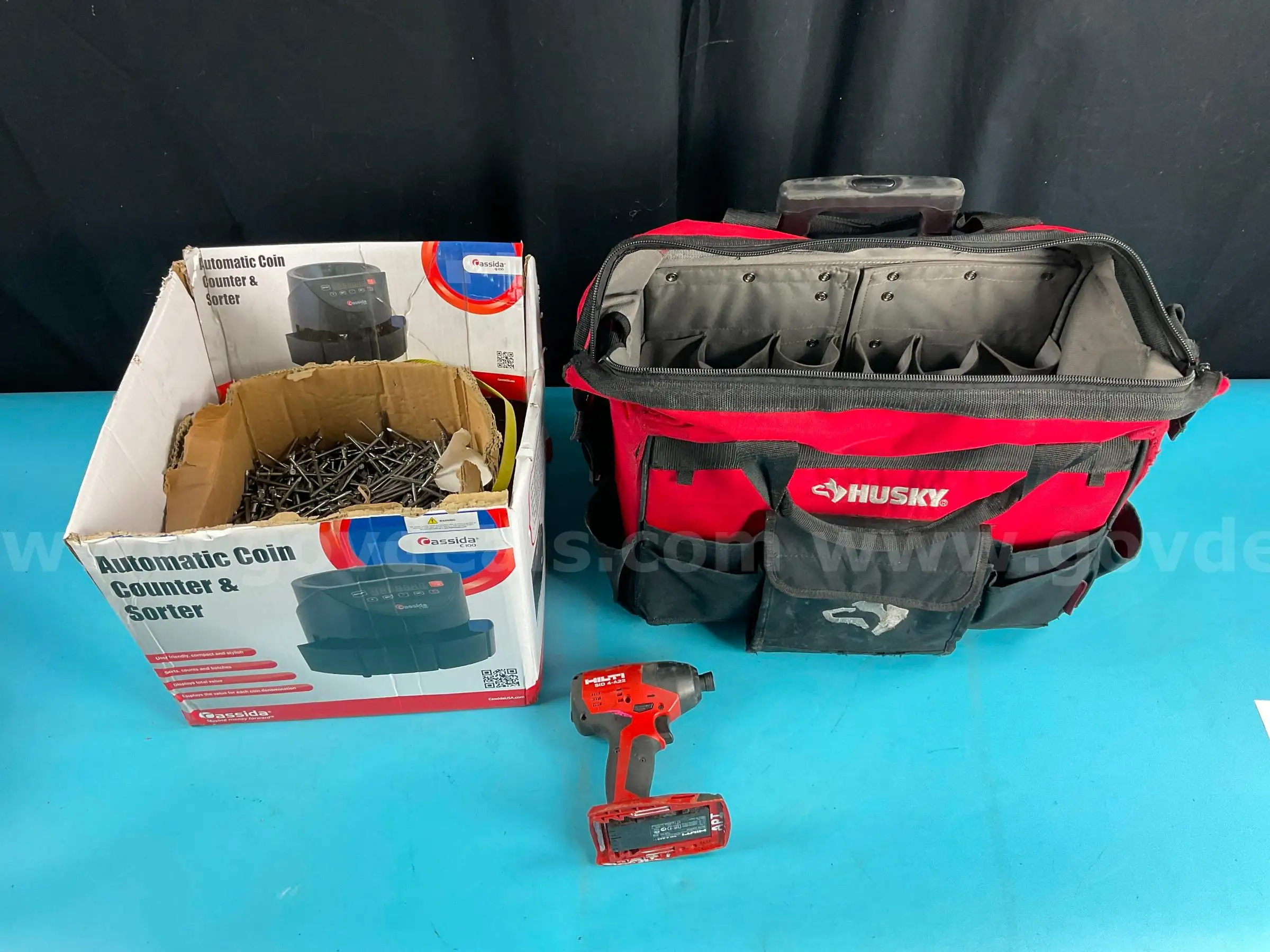 | Item: | Husky Rolling Tool Bag With Misc Hand Tools Nails & Hilti Cordless Impact Driver Without Battery Mod |