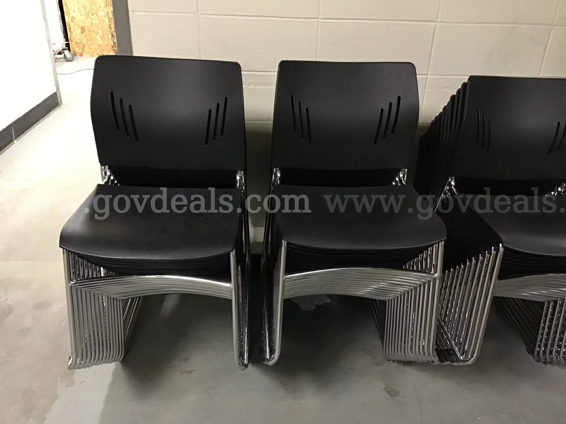 | Item: | LOT OF 59 BLACK PLASTIC STACKING CHAIRS W CHROME LEGS SOME WITH BLACK LEGS |