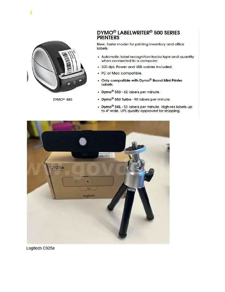 | Item: | Dymo 500 printer Logitech C925e Webcam tripod stands and Dymo Label Rolls |