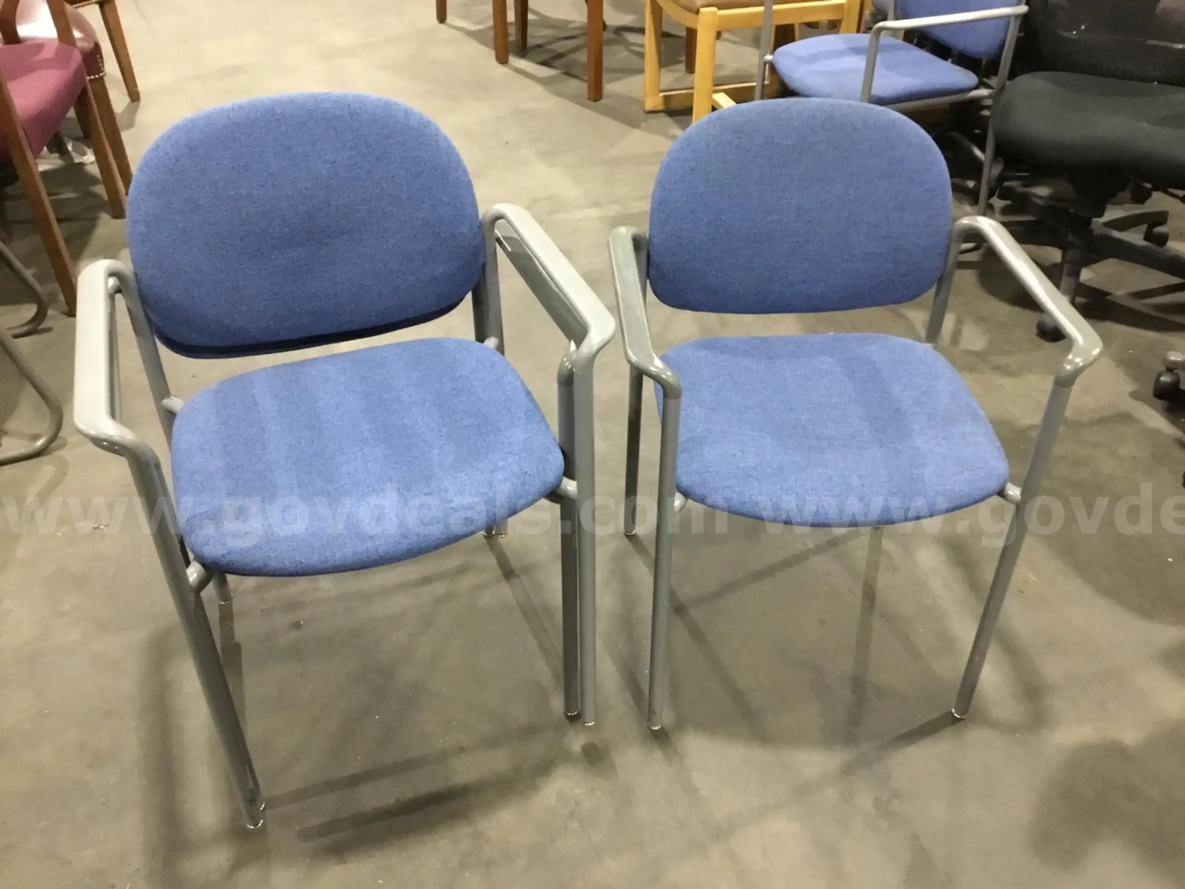 | Item: | Three Light Blue Stackable Chairs w gray legs “C” |