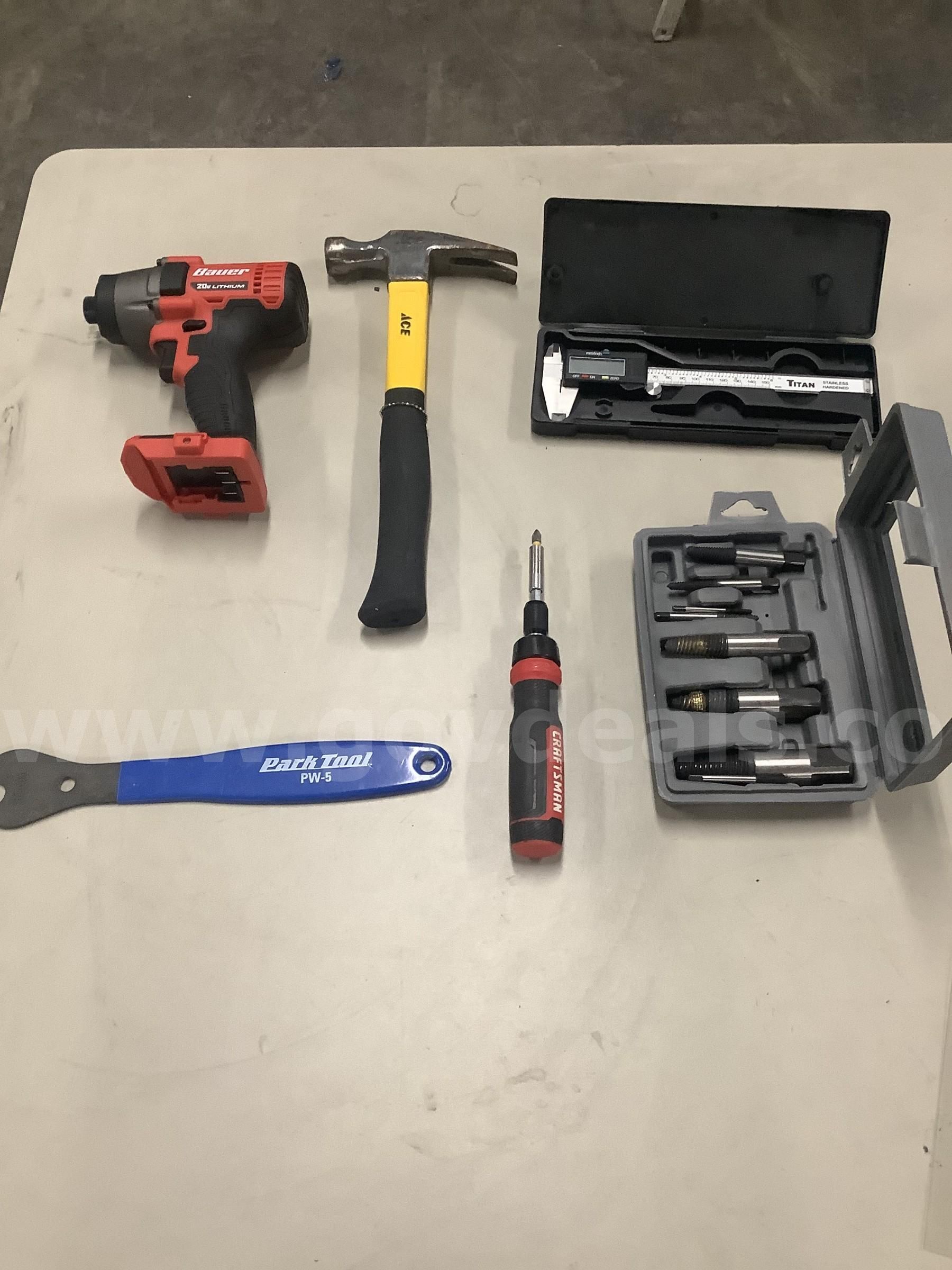 | Item: | Lot of misc box items-Bauer drill gun (NO BATTERIES NOR BITS) 8 screw extractor set digital caliper |