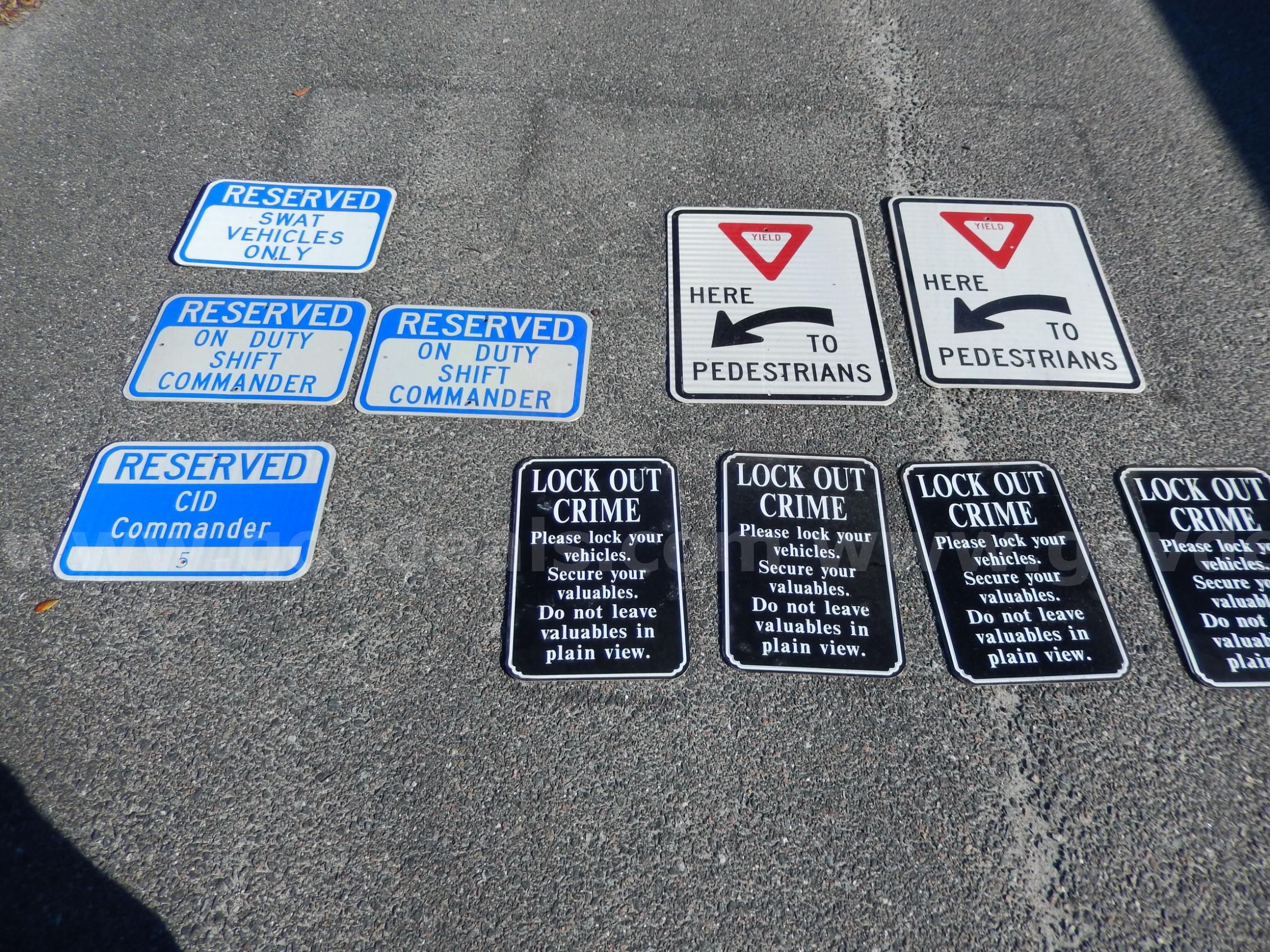 | Item: | USED (4) LOCK OUT CRIME SIGNS (1) RESERVED SWAT VEHICLES ONLY SIGN (2) YIELD HERE TO PEDESTRIAN SIGN |