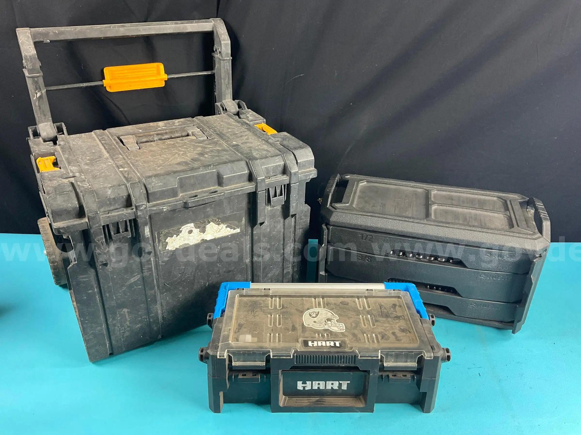 | Item: | 3 - Plastic Tool Boxes With Hand Tools Dewalt Hart & Unknown Brand |