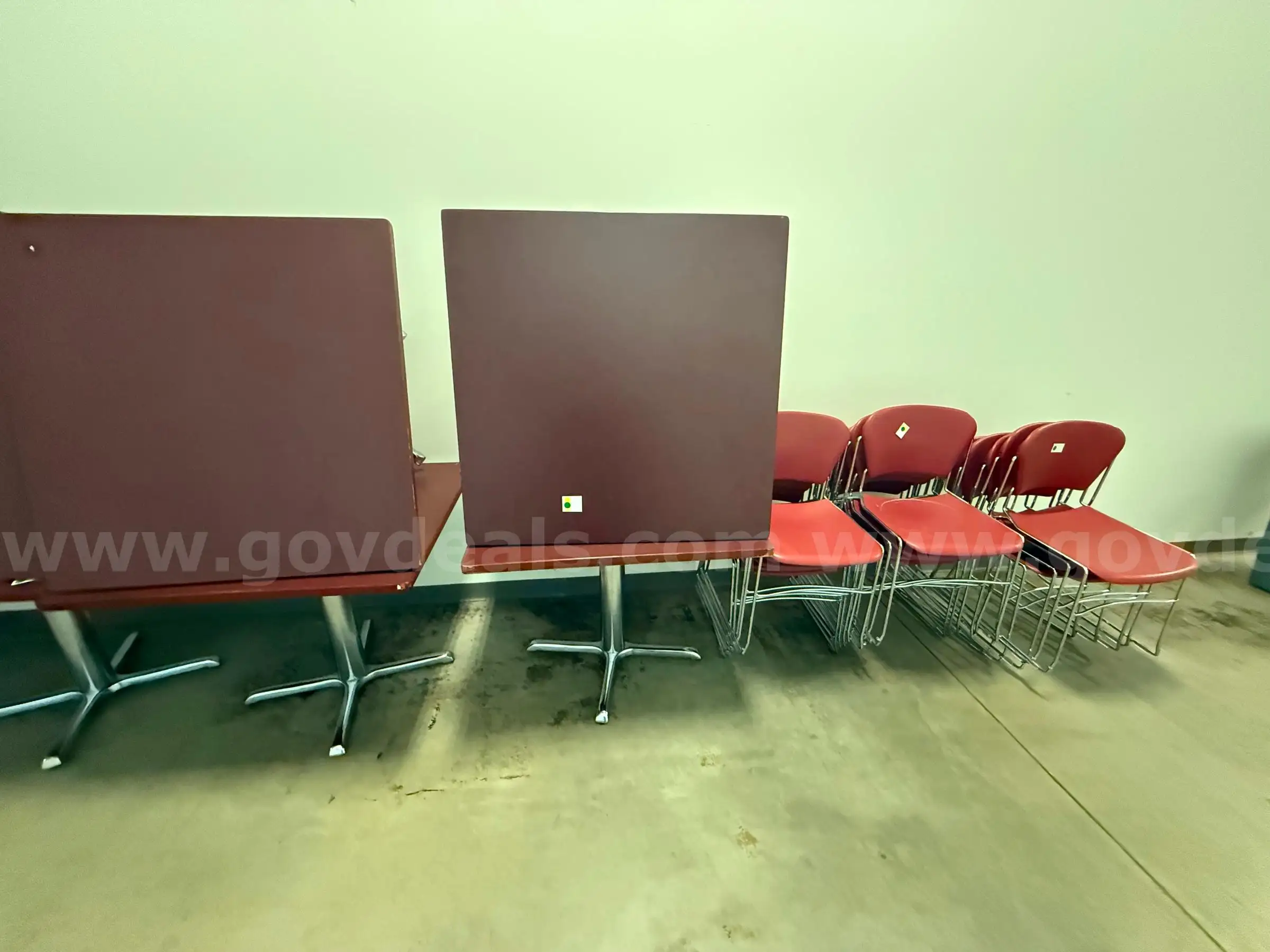 | Item: | 4 Amber Cherry Wood Top Tables with 16 Red Stacking Chairs |