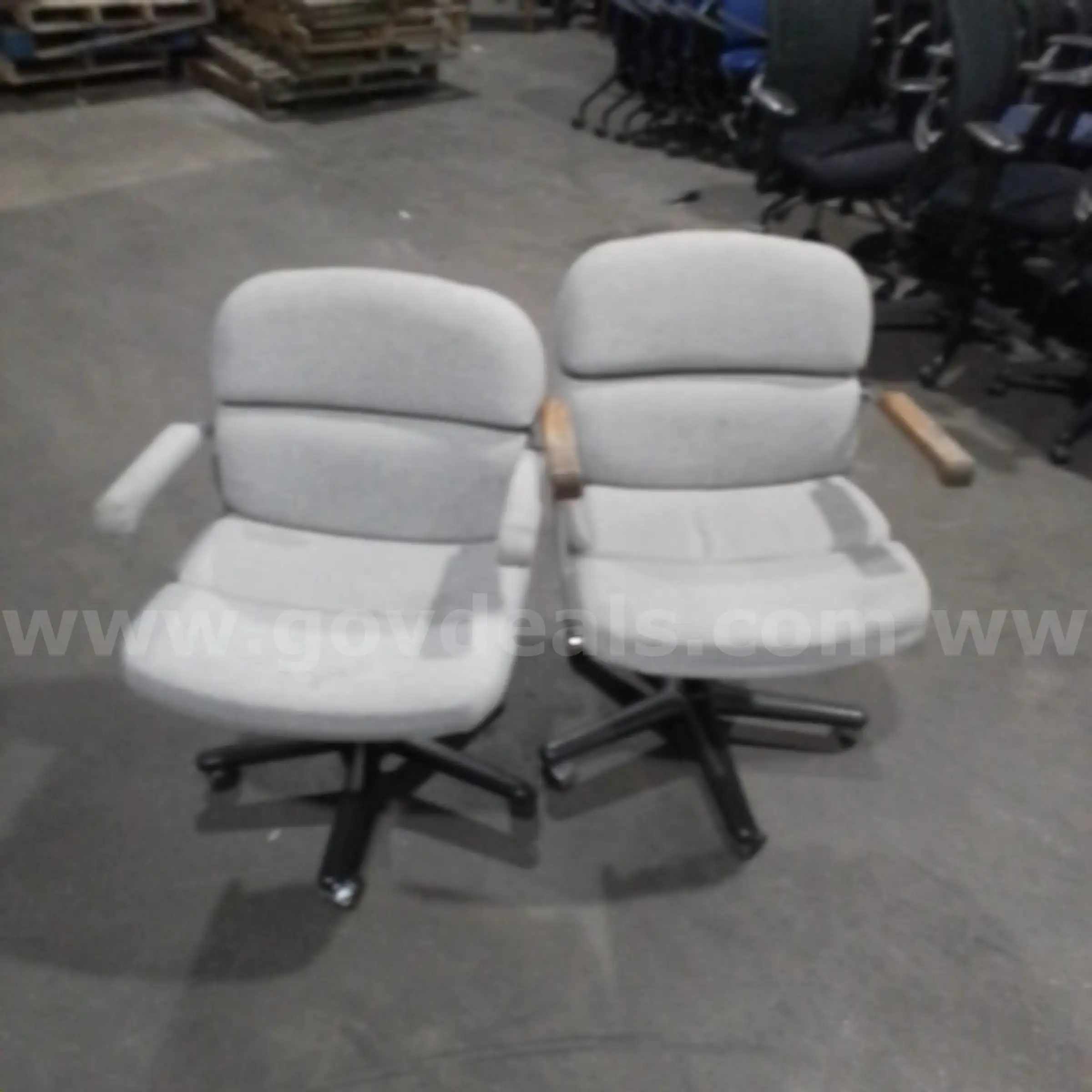 | Item: | Two Rolling Chairs Light Grey Fabric with Wooden Arms and Legs (2) JM |