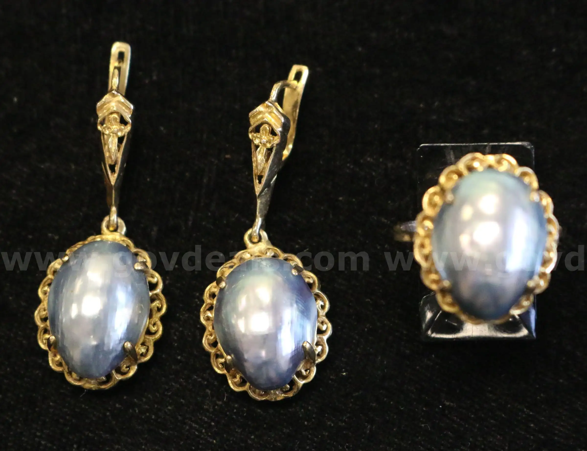 | Item: | 10K Yellow Gold Dangle Earring & Ring Set With Grey Mabe Pearls 9.4 Grams |